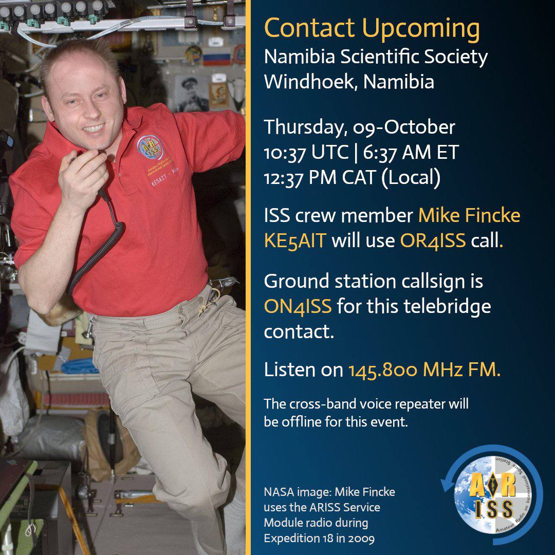 Diesen Donnerstag 9. Oktober ist ein ARISS-Kontakt mit der Nabia Scientific Society in Windhoek, Nabia geplant