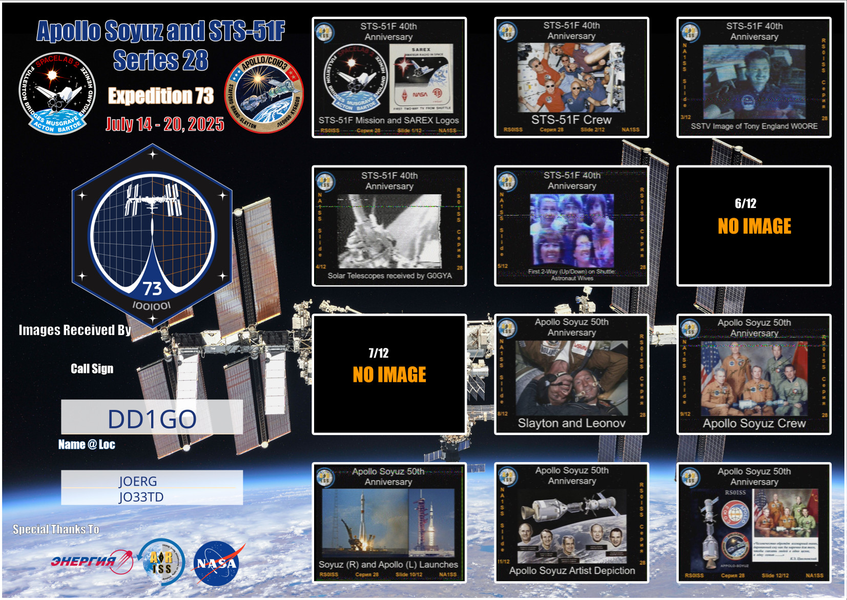 Die Übertragungen bestehen aus 12 Bildern der Apollo-Sojus-Mission und STS 51F, bei dem der SSTV-Betrieb auf Shuttles eingeführt wurde. Meine 10 Empfangen Bilder sind in der Übersicht: