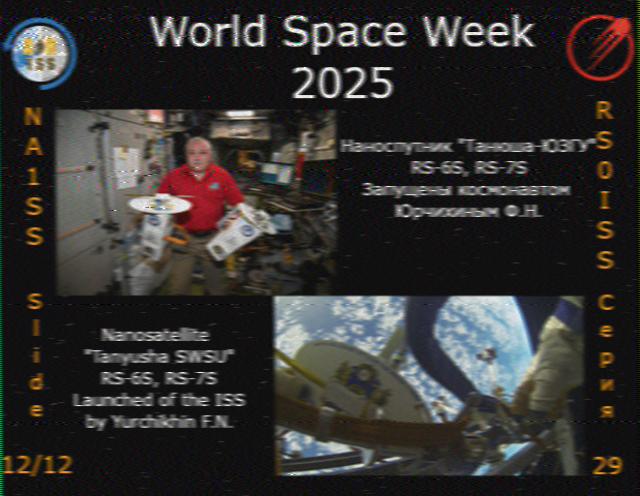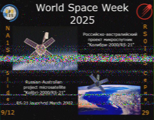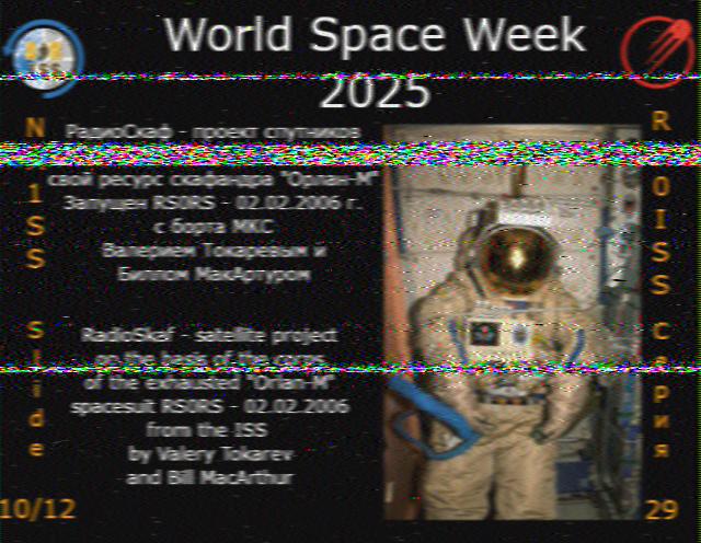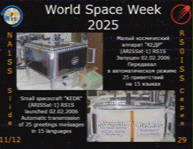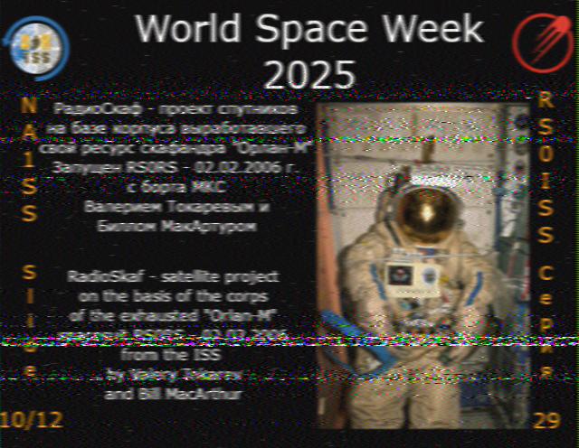 Ab dem 03. Oktober ging es gegen Mittag, lokaler Zeit, los mit den ersten Bildern (auf 145.8MHz +/- 2.5 Khz Dopplerschiftversatz ) in SSTV mode P120 von der 🔗Internationalen Raumstation. Es wurde sogar angekündigt, die zuvor nur bis Montag laufende Serie sogar bis Donnerstag laufen zu lassen. So hat jeder Gelegenheit ein Bild zu empfangen. Unterbrochen wird kurzzeitig für zwei Schulkontakte am Samstag und am Sonntag. Diese sollten und über Europa jedoch nicht stören, da beide Kontakte für Amerika geplant sind.