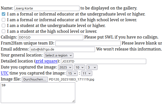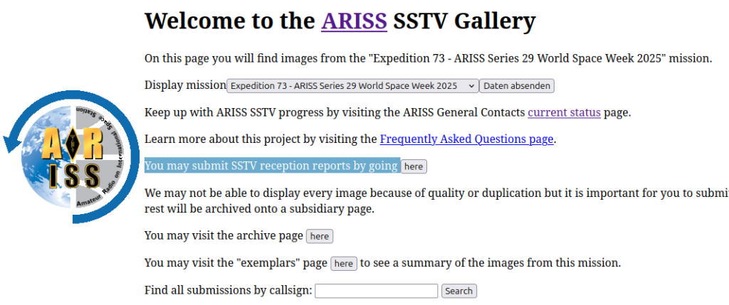 Wer ein Bild empfangen hat, kann dies auf der ARISS Seite hochladen und im Anschluss auch ds Diplom erhalten. Siehe hervorgeragten Bereich auf der Seite.